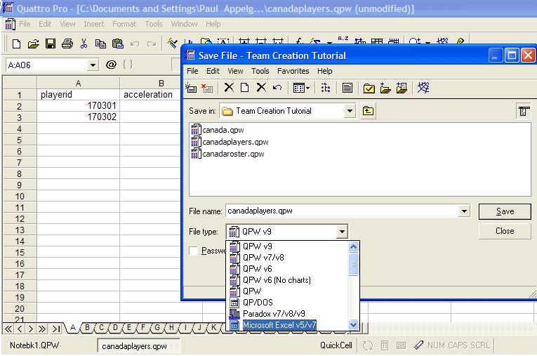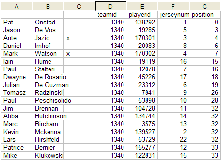Now it is time to create players. Notice in my list of players of Canada, I have some that have an "x" next to them. These are players that are not in the game. So I have to create them.