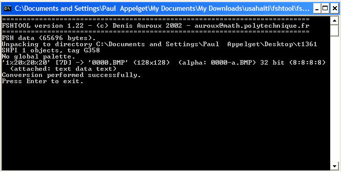 This is where you will need fshtool.exe. You need to drag the t1361.fsh on top of the fshtool.exe icon. Then it will extract the graphics.